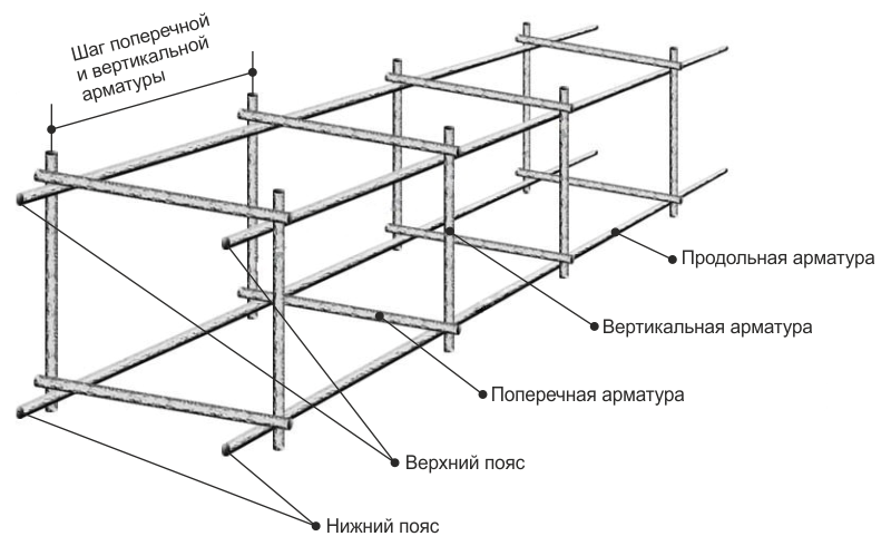 - Шаг поперечных и вертикальных стержней. Пояса скрепляются между собой при помощи стальных перемычек, расположенных горизонтально и вертикально. Расстояние между соседними поперечными (вертикальными) прутьями называется шаг, который вносится в соответствующее поле онлайн-калькулятора расчета арматуры.