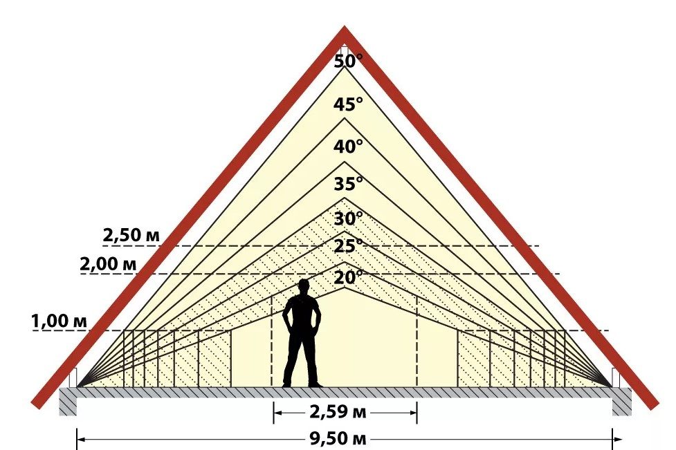 Правильный расчет угла наклона двухскатной крыши имеет большое значение при строительстве дома. От показателя зависят нагрузки, которые приходятся на кровельный материал и на стропильную систему. Некорректный просчет угла наклона кровли часто приводит к затрудненному сходу снеговых масс и воды с поверхности. Кроме того, угол наклона определяет высоту потолка и размеры мансардного этажа.