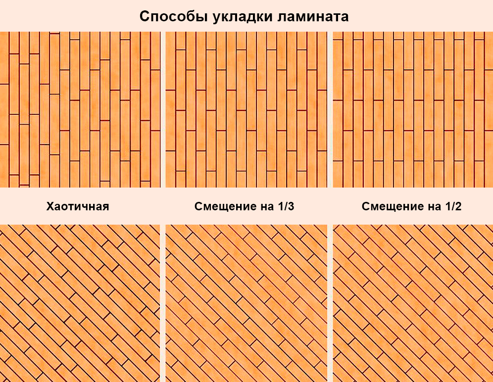 В обоих случаях ламинат можно укладывать хаотично, со смещением на 1/2 и 1/3.