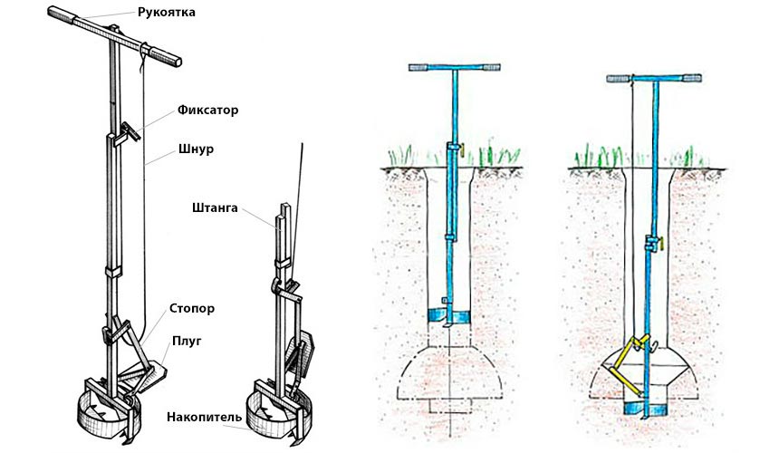 - Выполнение расширения скважины в основании. Для этого необходимо привести лопатку в рабочее положение при помощи троса и продолжать вращение бура.
