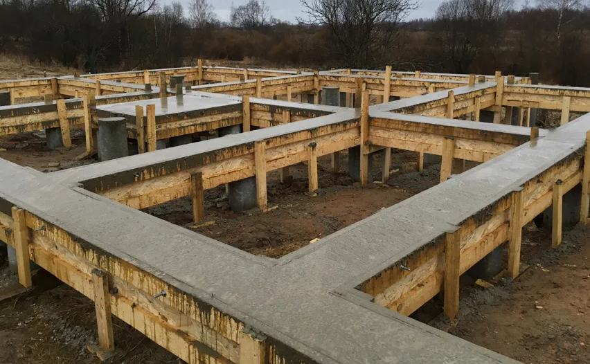 После полного застывания бетона ростверк фундамента ТИСЭ служит основанием для строительства стен дома.