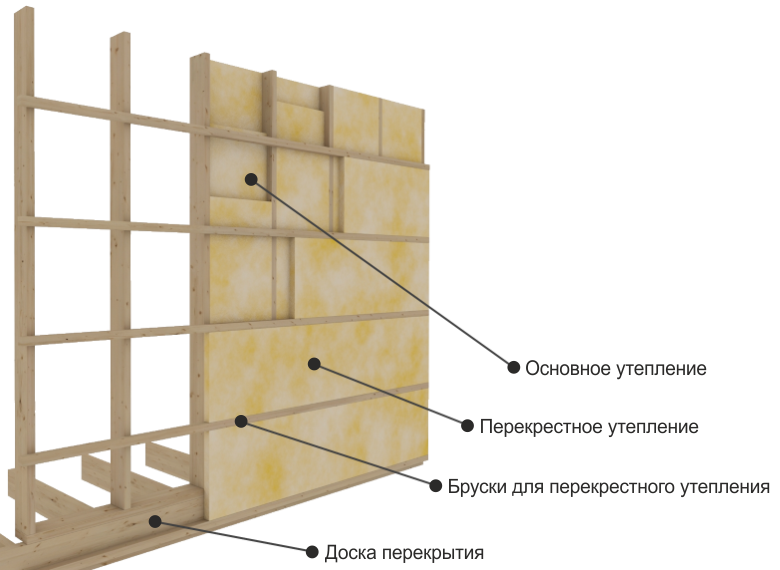 Цель перекрестного утепления – перекрыть мостики холода в местах, где установлены стойки и другие деревянные конструкции каркаса. Для этого с внешней стороны стены производится дополнительное утепление плитой минваты толщиной 50 мм.