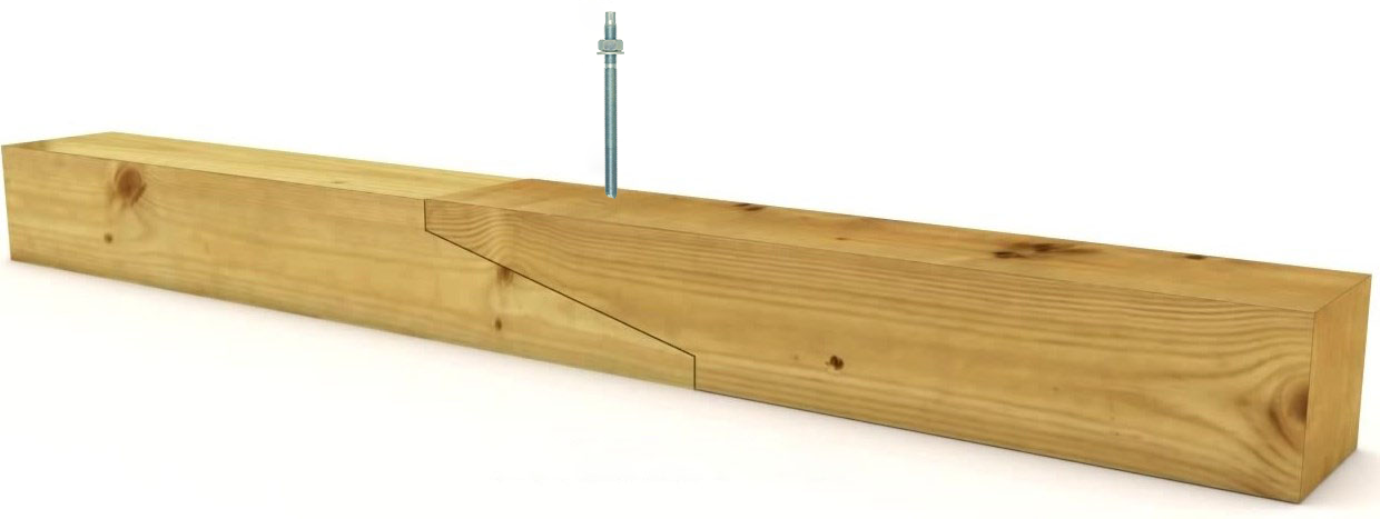 Технология достаточно сложна в исполнении и обеспечивает слабое соединение, поэтому применяется редко. Подходит для сращивания бруса. Места соединения подрезаются под определенным углом, стыкуются и плотно крепятся между собой шпилькой или болтом с усиленными шайбами. Размер среза должна быть не менее двойного размера высоты бруса. Отверстие под шпильку должно соответствовать диаметру самой шпильки или чуть меньше для обеспечения плотного соединения.
