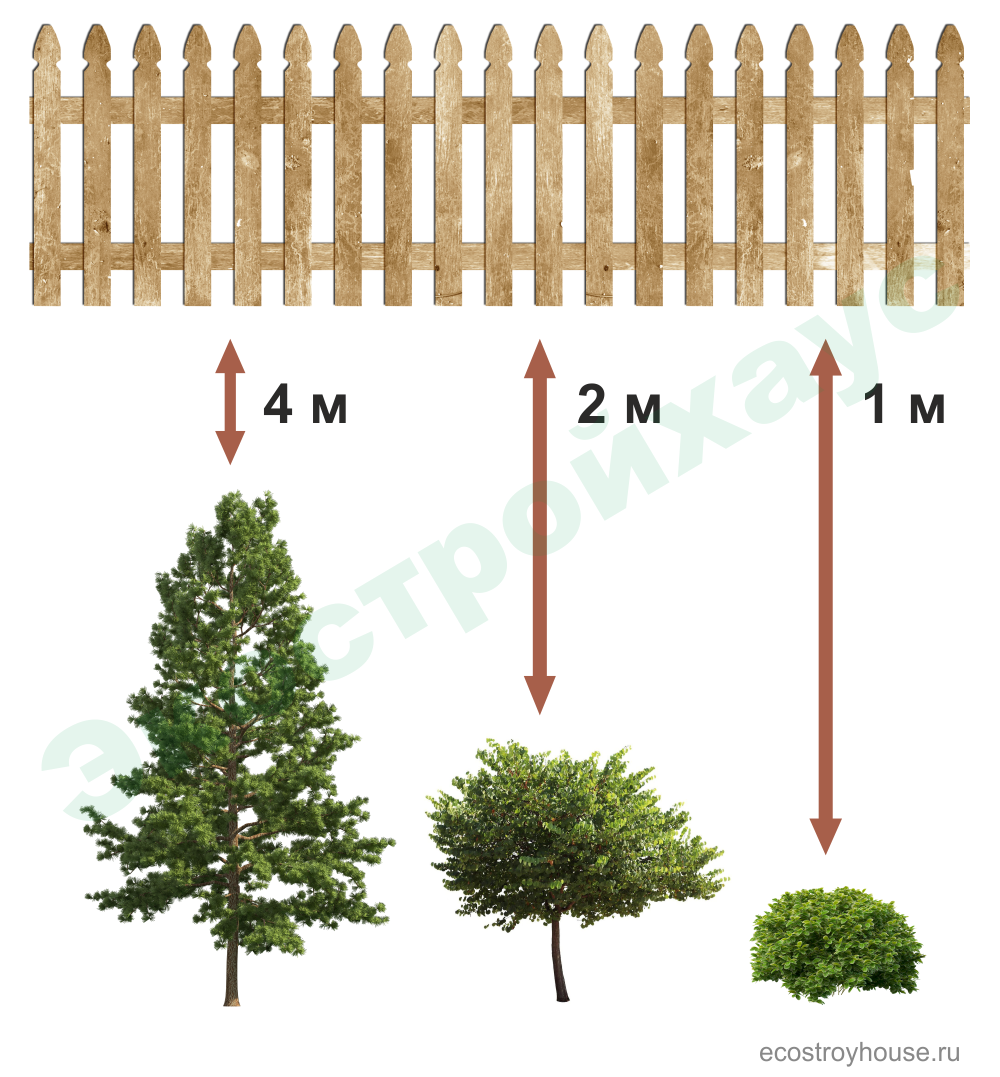 Высокорослые, например, яблоня, груша или лесные деревья (ясень, дуб, береза, ель, сосна и др.) должны располагаться на расстоянии не менее 4 м от забора соседей.