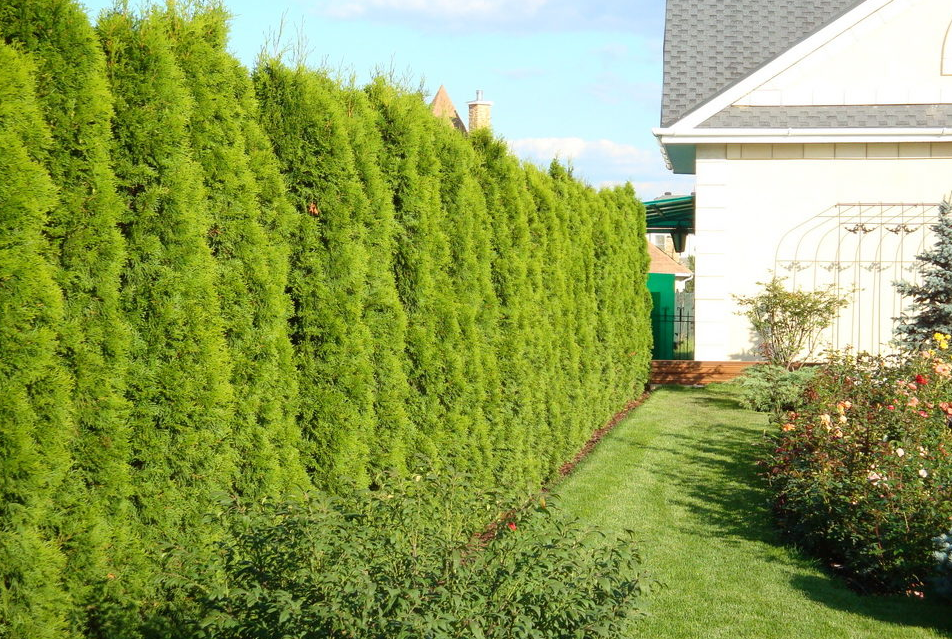 Живая изгородь между участками — это тоже вид посадки, на который распространяются нормы расстояния между деревьями, кустарниками и заборами. Например, если вы решили отгородиться от соседей малиной, придется отступить метр от границы участка. Если вы решили сажать вместо ограждения туи или пихты, придется отступить минимум на 2 метра. То же касается и посадки декоративных кустарников.